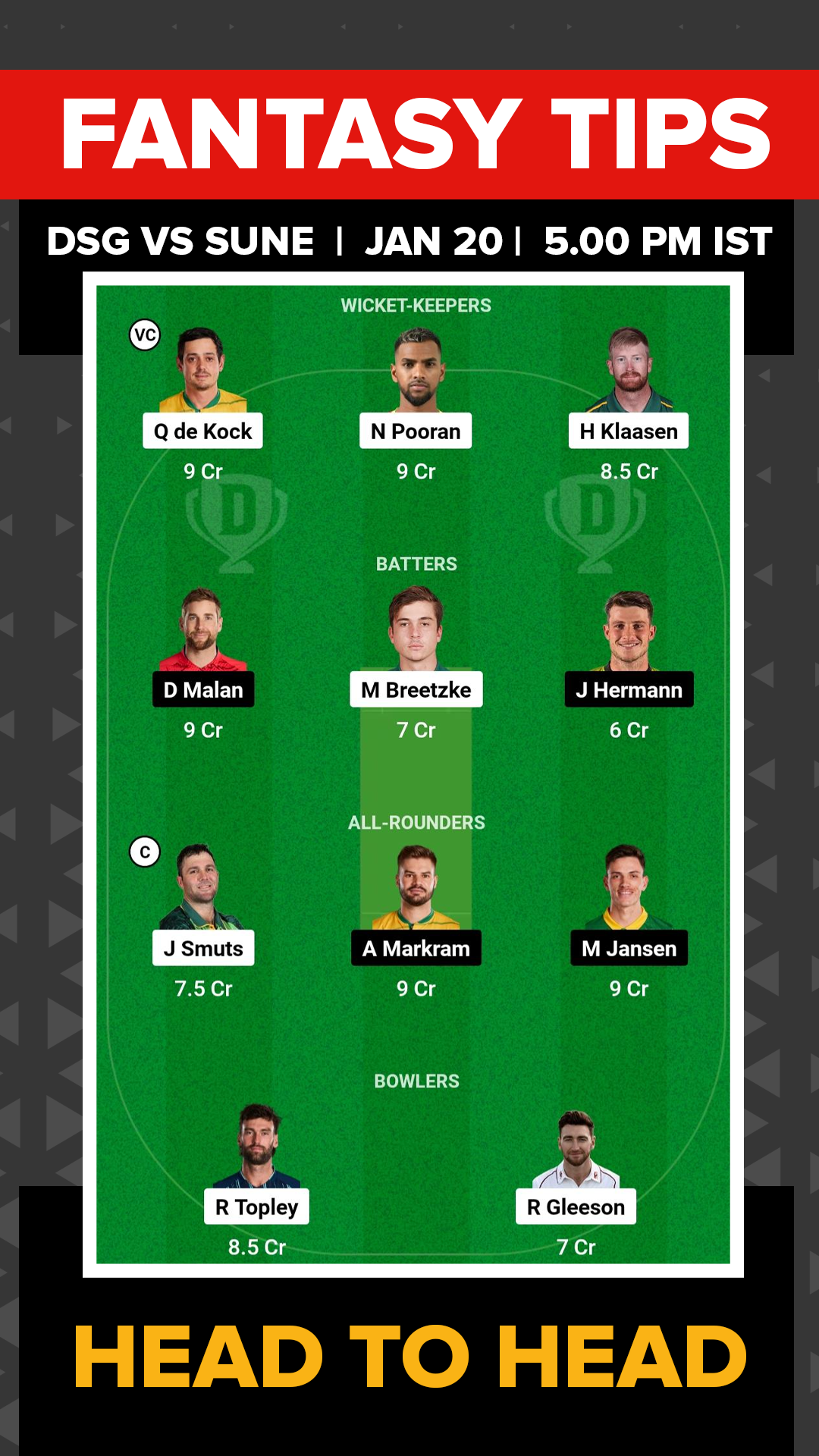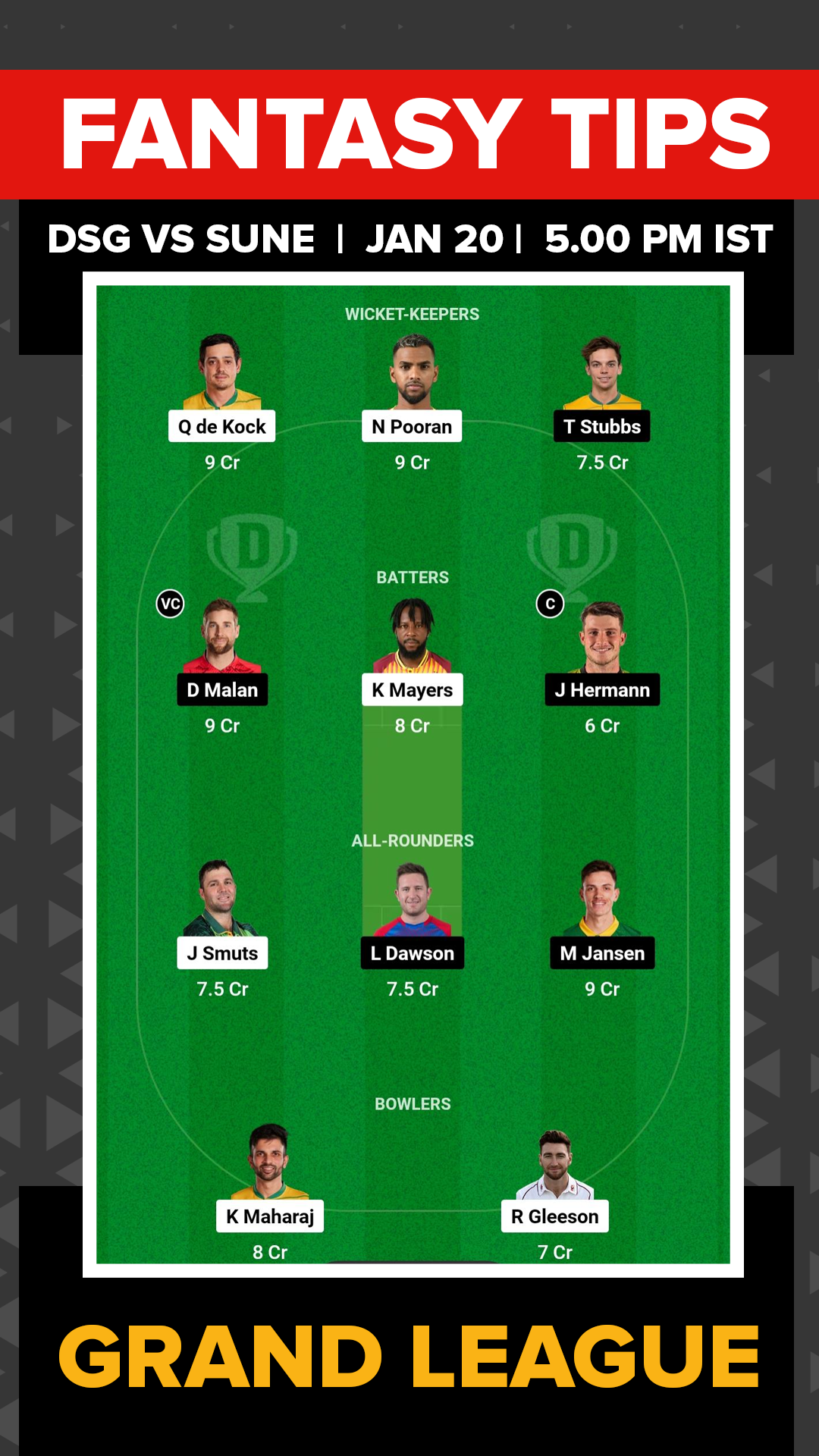 Sunrisers Eastern Cape (SUNE): Sarel Erwee, Adam Rossington, Dawid Malan, Jordan Hermann, Aiden Markram, Tristan Stubbs, Marco Jansen, Liam Dawson, Craig Overton, Sisanda Magala, Simon Harmer