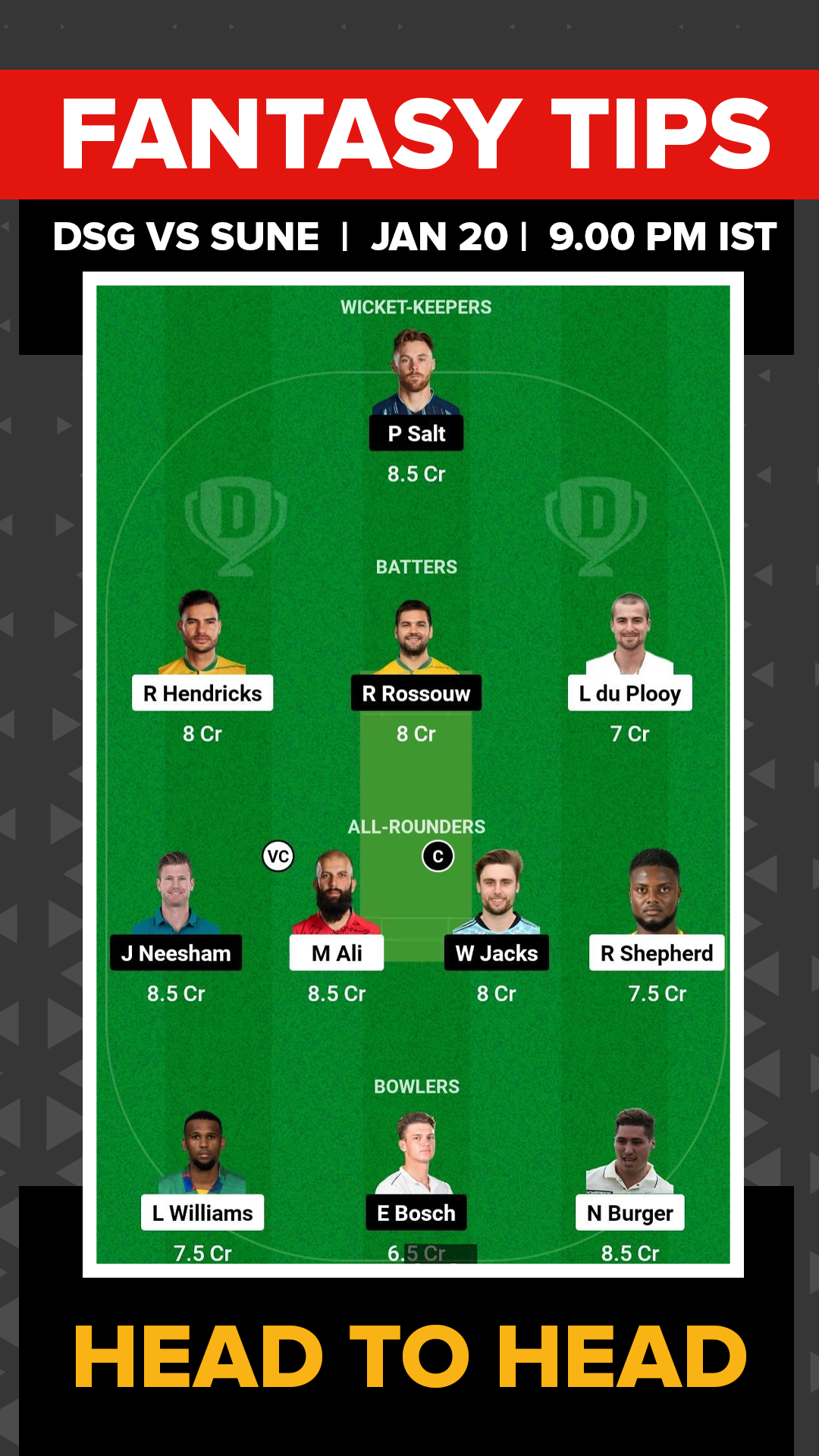 Joburg Super Kings: Faf du Plessis(C), Reeza Hendricks, Ronan Hermann(WK), Leus du Plooy, Moeen Ali, Donavon Ferreira, David Wiese, Romario Shepherd, Lizaad Williams, Nandre Burger, Imran Tahir.