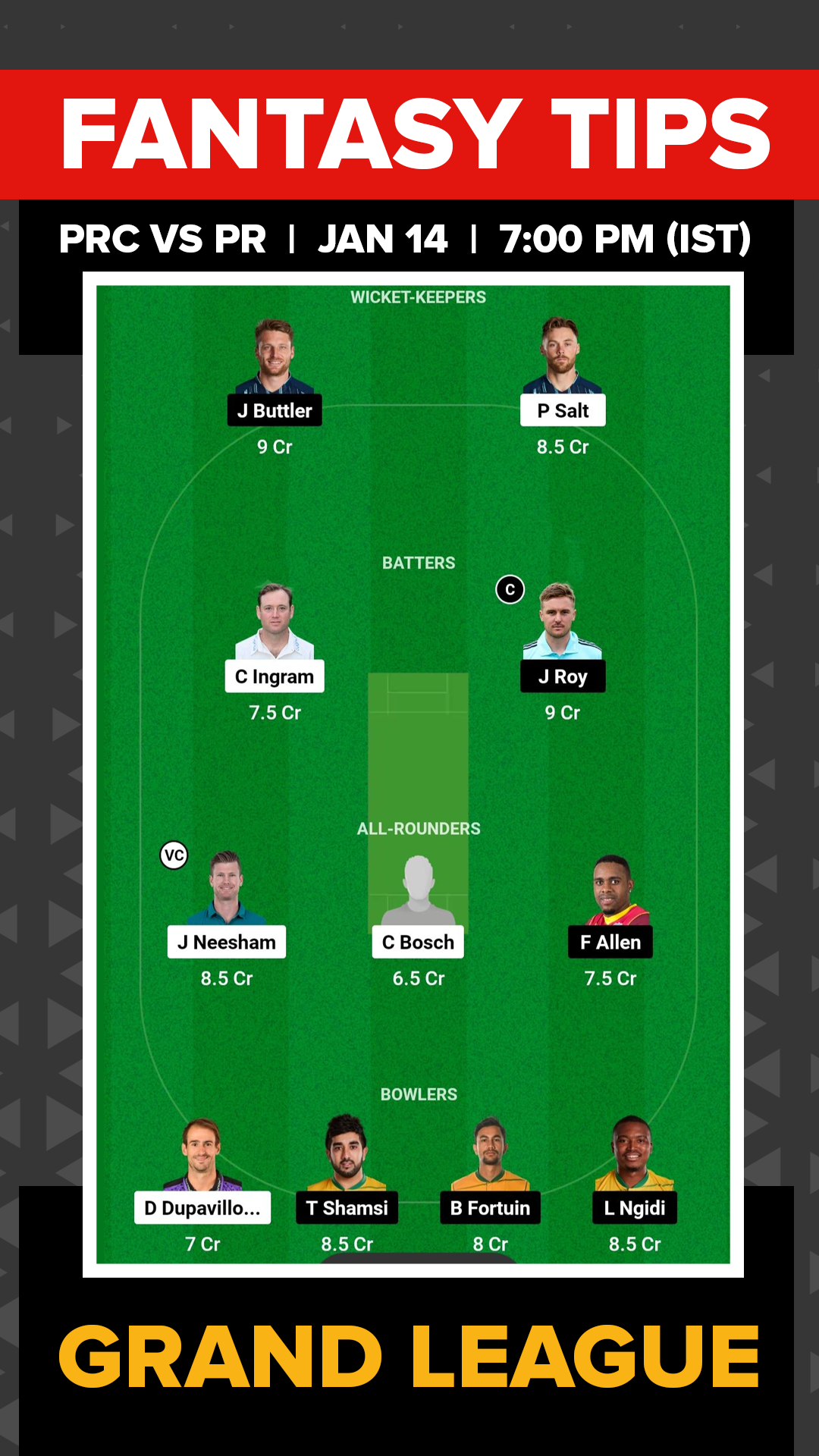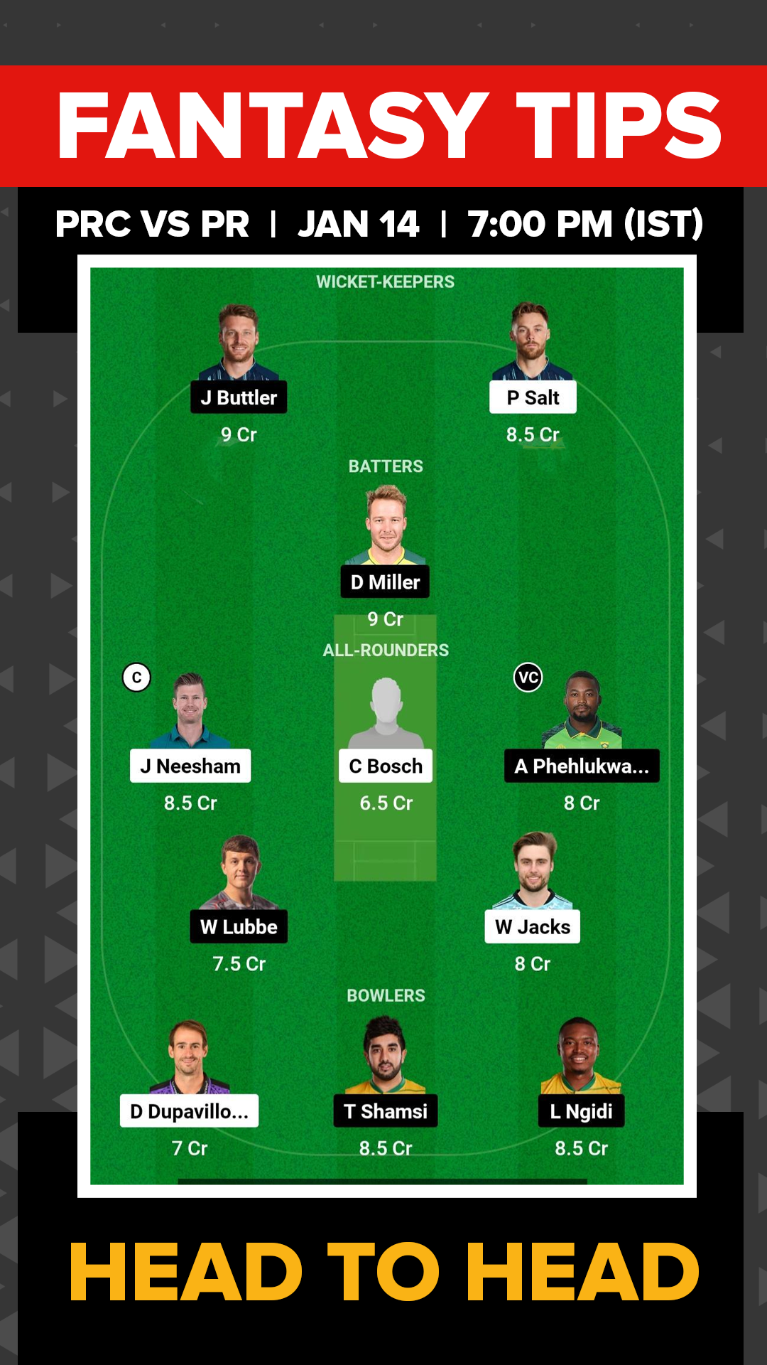 PR Probable XI: Jos Buttler (wk), Jason Roy, Wihan Lubbe, Dane Vilas, David Miller (c), Andile Phehlukwayo, Fabian Allen, Bjorn Fortuin, Tabraiz Shamsi, Lungi Ngidi, Obed McCoy
