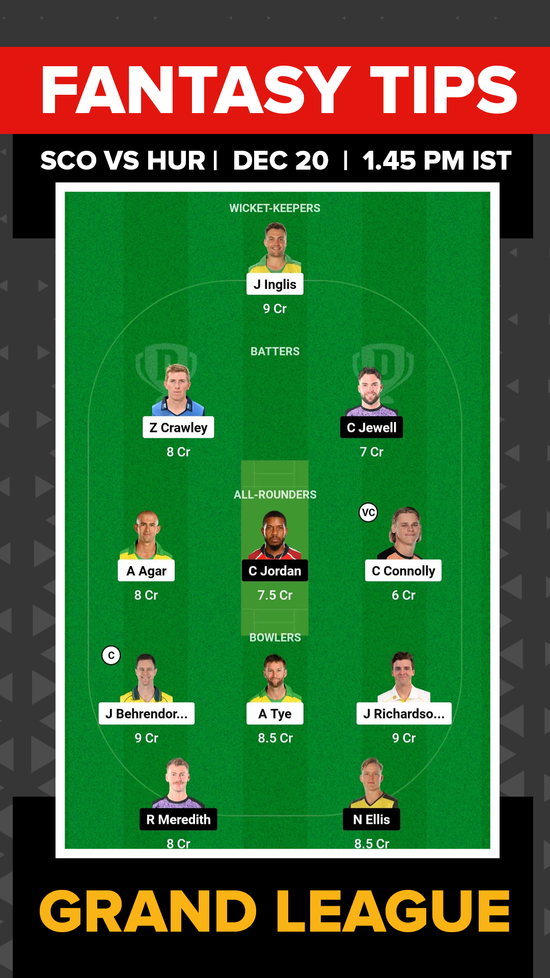 Hobart Hurricanes: Matthew Wade (C & WK), Caleb Jewell, Ben McDermott, Zak Crawley, Tim David, Corey Anderson, Chris Jordan, Nathan Ellis, Patrick Dooley, Riley Meredith, Billy Stanlake.